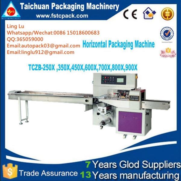 Horizontal pillow flow pack is suitable for :Food (Snack bar,bread,cookies,ice lolly,cake.chocolate,) Plastic(Cutlery,tray,) hardware(handle,bearing,Car parts, washer, ) Soap,sponge,tissue,Card..... etc